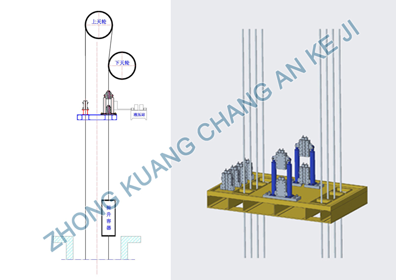 4、采用液壓步進提升機構,實現(xiàn)提升繩的連續(xù)提升;